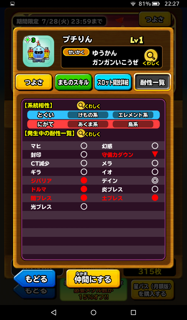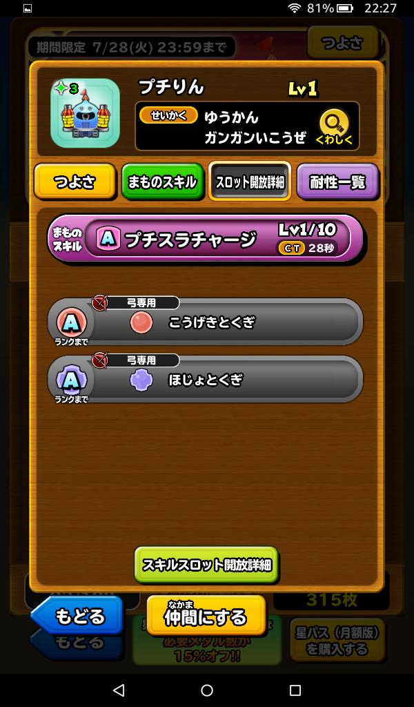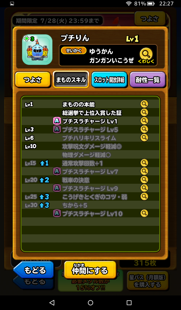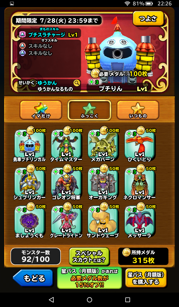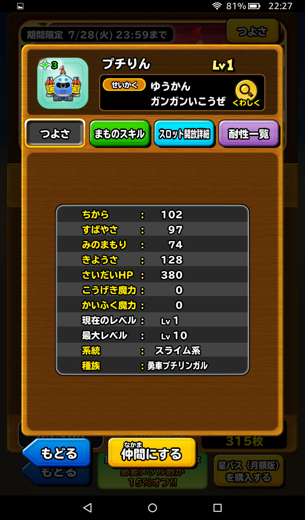 星ドラのモンスター闘技場スペシャルスカウトのふっこく版で勇車プチリンガルをゲット。