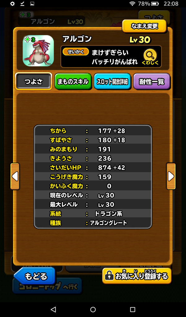 星のドラゴンクエストにおけるモンスター闘技場のアルゴングレートのLv30ステータスです。