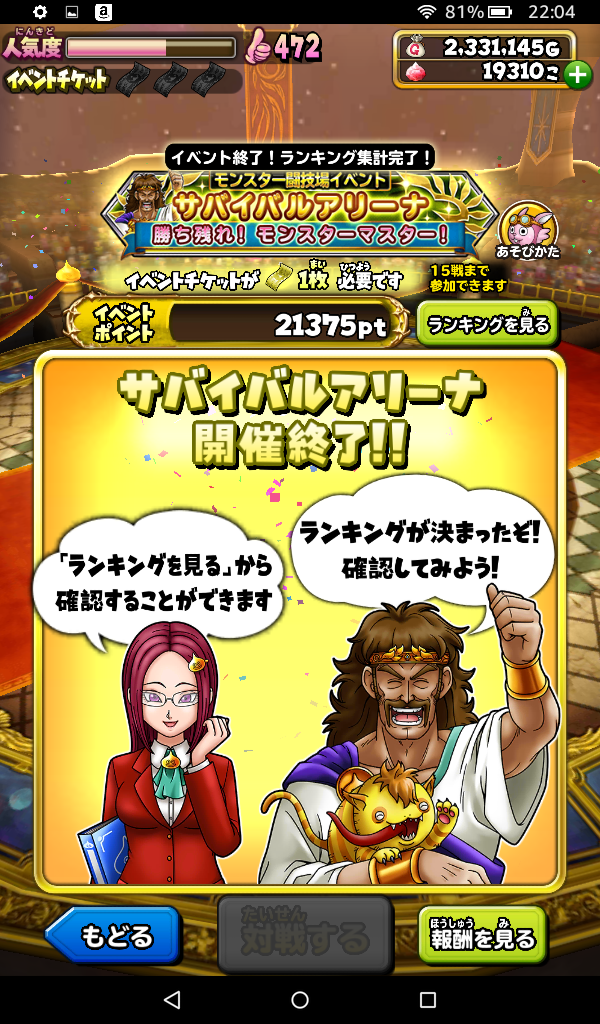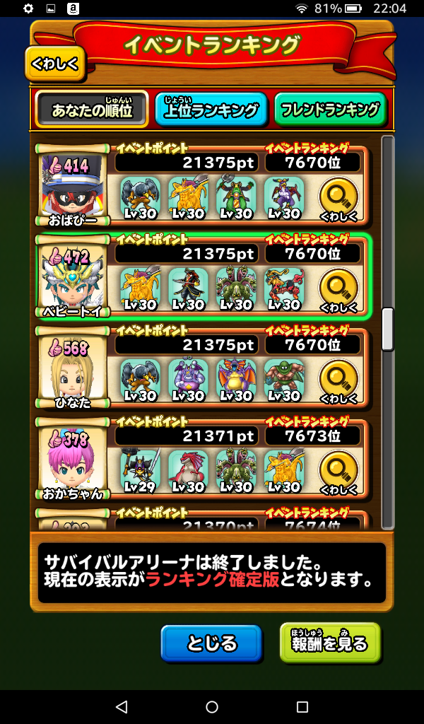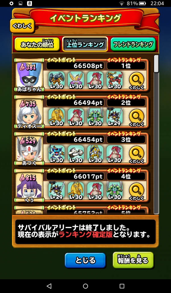 第3回サバイバルアリーナの獲得ポイントとランキングです。