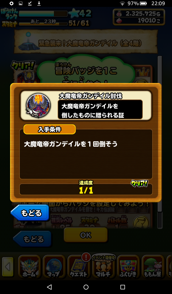 大魔竜帝ガンデイル討伐の冒険バッジをゲットした。