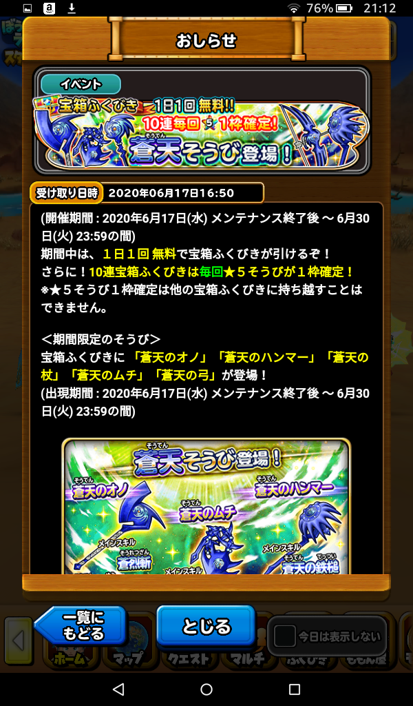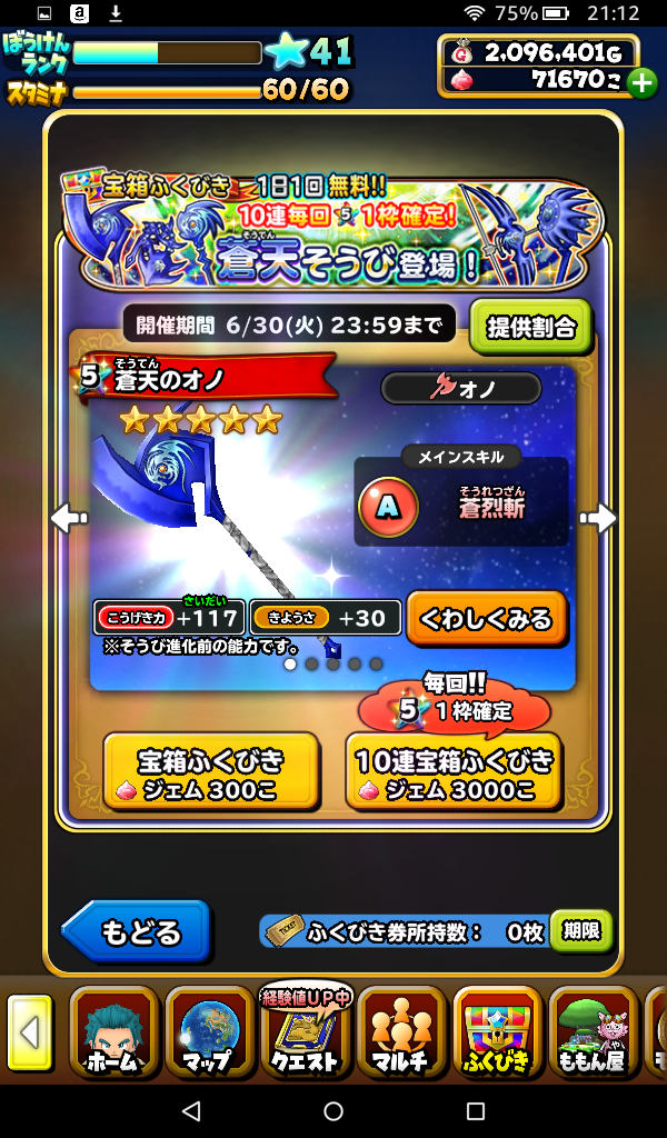 開催期間2020年6月17日(水)~6月30日(火)23:59の間の蒼天そうびふくびきに挑戦しました。