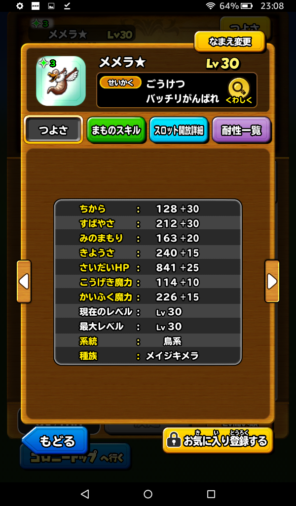星のドラゴンクエストにおけるモンスター闘技場の逸材メイジキメラのLv30ステータスです。