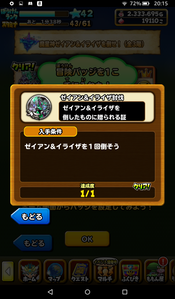 ゼイアン&イライザ討伐の冒険バッジをゲットした!
